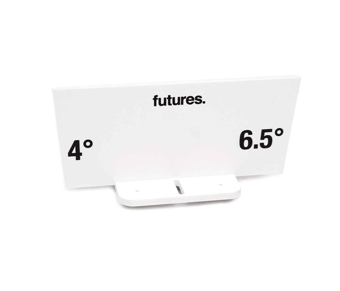 The Futures Angle Jig was designed to set the proper fin angle when installing the Futures boxes. Futures side fins are set at 6.5 degrees, Quad Rears at 2 or 3 degrees, and Longboard Side Bites at 3 or 4 degrees.