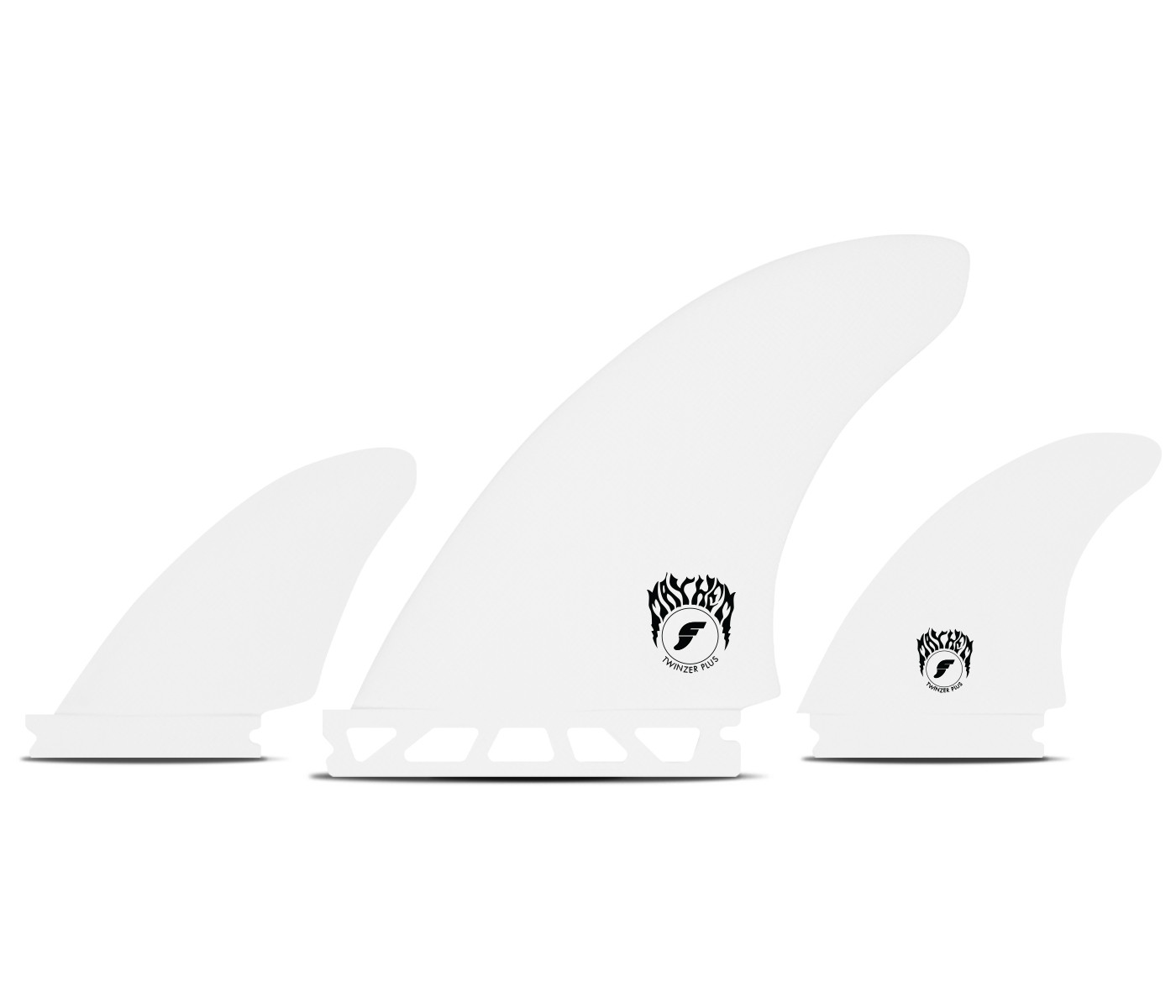 "The TWINZER+ fin setup is a modern performance take on the classic Twinzer fin design, but with an added twist. A TWINZER+ rear stabilizer trailing fin adds more punch, more power, and even more contrai to a typical Twin, Twinzer, or Twin+ trailer. Like other Twinzers, the forward canard fins extend the base, claw into the wave face, and apply more pressure to the bottom of the board. Because of this, a more upright, narrower-base, lower-area twin is used. We love the current crop of "circumcised," snip-tip twins currently on the market and created a template based on this fast-reacting tip. To make things flow, the forward canards feature the same tip template and a trailing edge that parallels the leading edge of the main twin, creating a complementary Flow.
